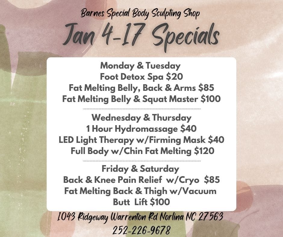 Whether your goals include starting your weight loss journey, detoxing your body, becoming healthier overall, or simply wanting to tighten and tone, we have something designed just for you. At Barnes Special Body Sculpting Shop, our non-invasive treatments and all-natural wellness products are created to support your body from head to toe.